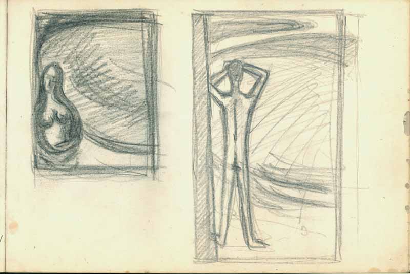 Das Skizzenbuch 3 umfaßt ca. den Zeitraum zwischen 1950 bis 1953. Es beinhaltet Zeichnungen in Bleistift und Tusche sofern nicht anders vermerkt. Es ist 33,0 x 22,5 cm groß. |