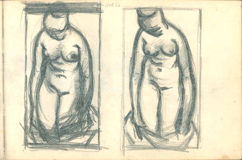 umfaßt ca. den Zeitraum zwischen 1950 bis 1953. Es beinhaltet Zeichnungen in Bleistift und Tusche sofern nicht anders vermerkt. Es ist 33,0 x 22,5 cm groß. |