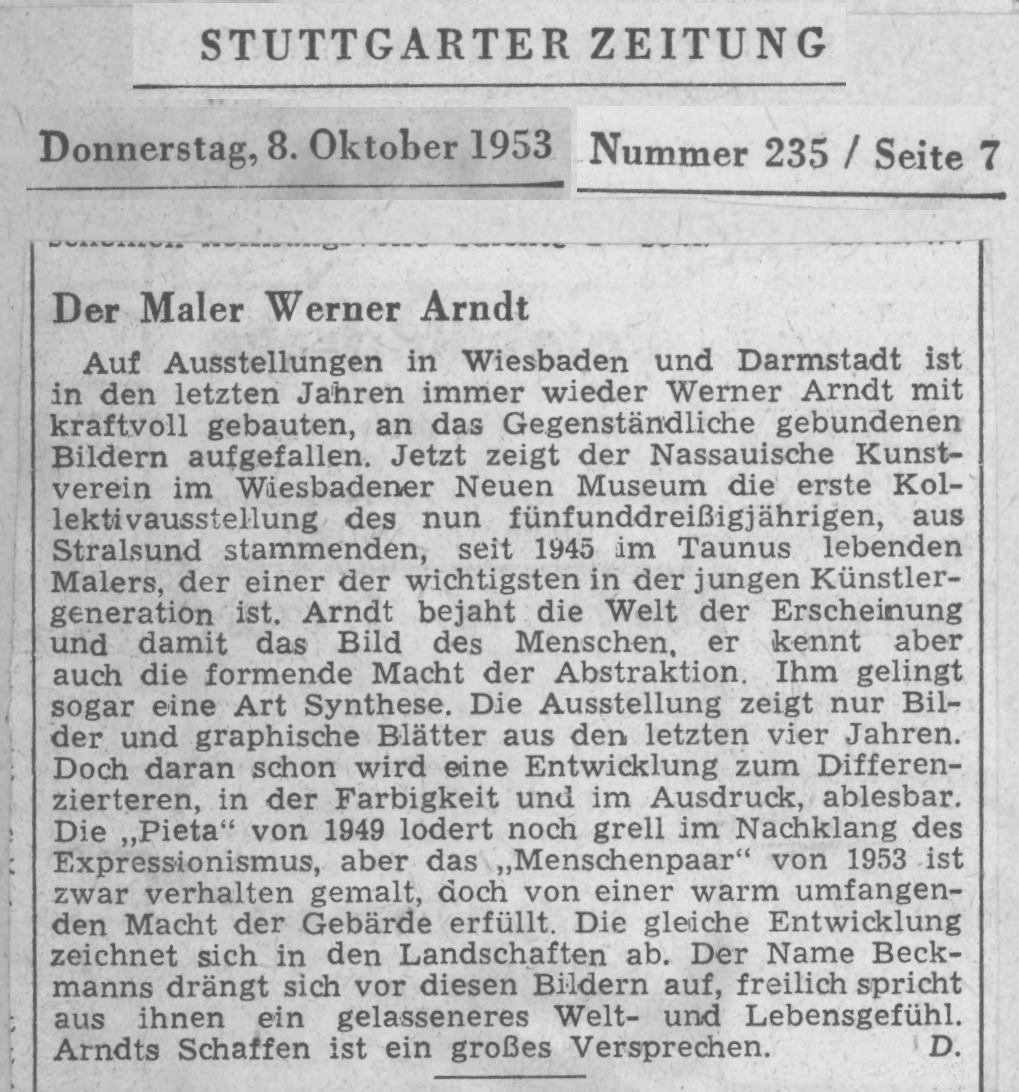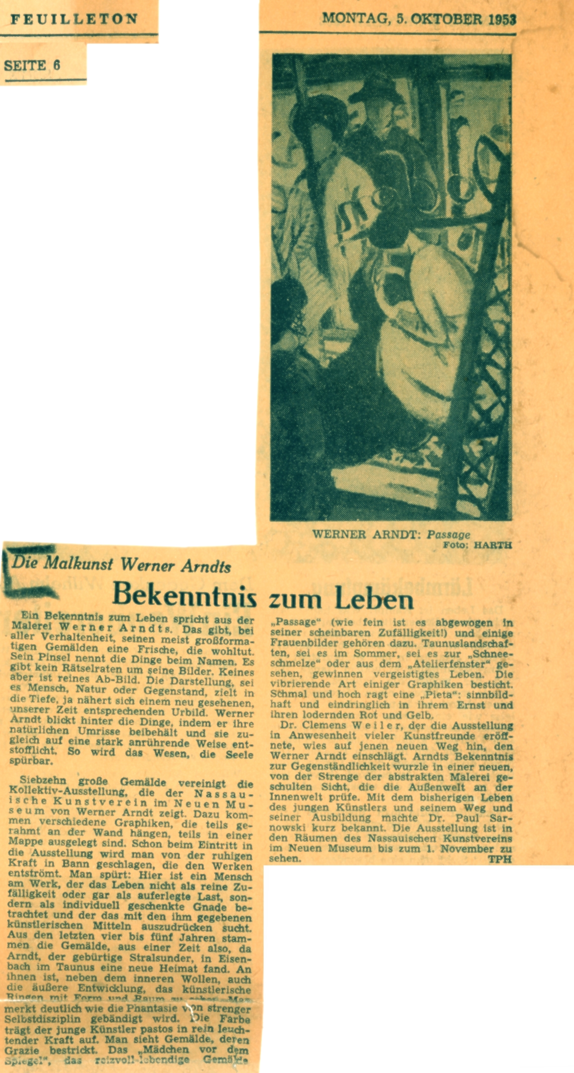Wiesbadener Tagblatt vom: 5.Okt.1953 Bekenntnis zum Menschen und zum Gegenstand Werner Arndts Gemälde in der Ausstellung des Nassauischen Kunstvereins
