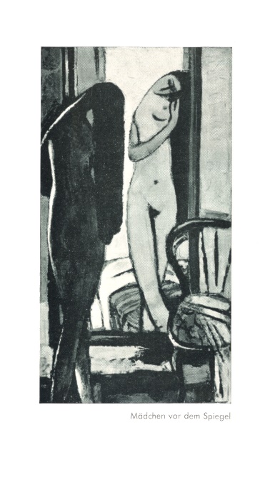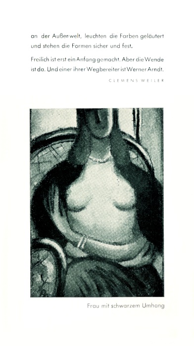 FRANKFURTER ALLGEMEINE ZEITUNG (Montag, 5.Oktober 1953 / Nr. 231, Seite 6 + Abbildung: "Mädchen vor dem Spiegel.") Der Maler Werner Arndt Vor wenigen Jahren wurde man zuerst in der Darmstädter Sezes- sion auf den 1918 in Stralsund geborenen Werner Arndt aufmerksam. Heute zeigt das Museum Wiesbaden eine erste Sonderausstellung seiner Werke, namentlich solcher aus den letzten zwei Jahren; wir erleben ein unbeirrtes Fortschreiten des Künstlers. Ernste Besinnlichkeit und die Vorliebe für expressive Wirkungen mögen ein Erbteil der norddeutschen Heimat sein. Auch in den meist kräftigen Farben zeigt sich eine gewisse Anlehnung an die großen, aus Norddeutschland stammenden Meister des deutschen Expressionismus. Sehr wichtig ist ferner Beckmann mit den Bildern seiner Frankfurter Epoche gewesen. All diese Anre- gungen werden jedoch sicher und selbständig verarbeitet und weiterentwickelt. Die Formensprache von Arndt scheint sich von knittrigen oder zackigen Linien zu gerundeter Weichheit weiter zu entwickeln. Arndts Absicht, die sichtbare Welt darzustellen, gerät hier und da in Konflikt mit dieser Vorliebe für melodiöse Kurven. Hier scheint noch nicht alles gelöst. Themen Arndts sind neben Landschaften vor allem Figurenbilder; wir heben von Werken der allerletzten Zeit die "Frau mit dem Umhang", das "Selbstbildnis" und die "Passage" hervor. Arndt lebt seit Kriegsende zurückgezogen in einem Taunustal.------------------------------------------------------ --------------------------------------------------------------ebg |