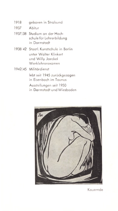 Stralsund geboren, also zur jungen Genera-tion gehörend, hat an der Staatlichen Kunstschule in Berlin bei Willy Jaeckel studiert.