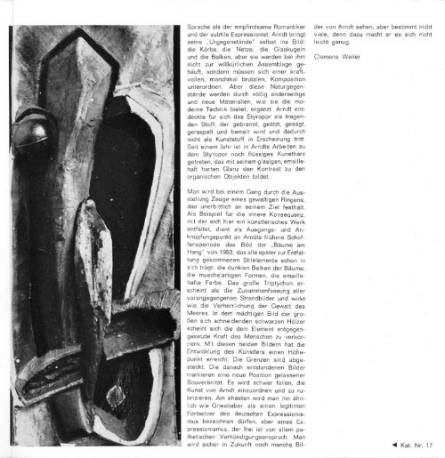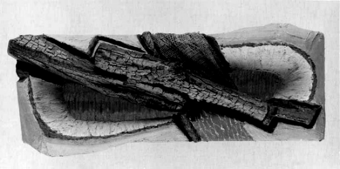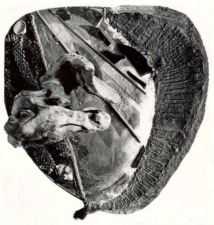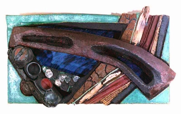 Anmerkung: Styropor bearbeitet (geätzt, verbrannt, geraspelt), mit Stoff verkleidet, verputzt und mit Dispersionsfarben malt. Dazu eingebettete Naturstücke und Pressungen.