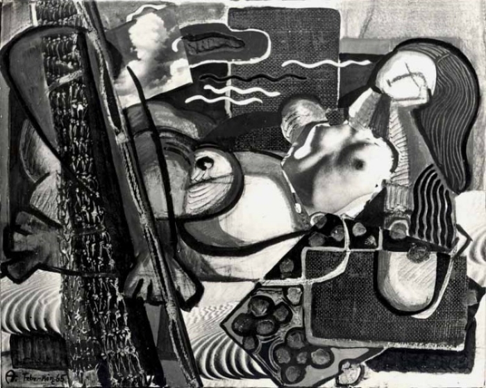 5 Liegendes Paar, 1962; Dispersionsfarbe, Wellpappe, Stoff und Putz - 89 x 210 cm