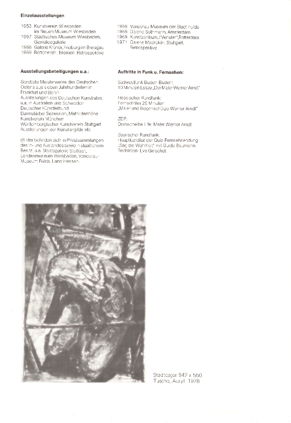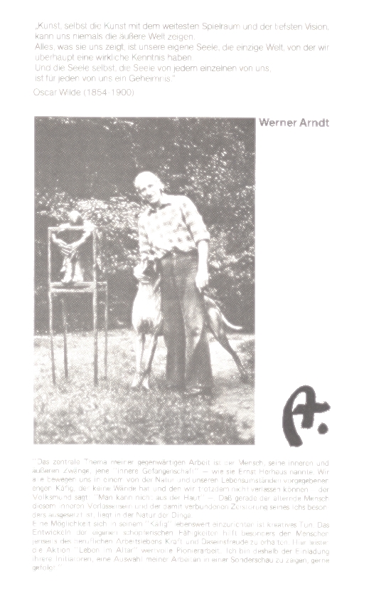 Werner Arndt überlegte, dann sagte er: "Ich komme durch unsere Unterhaltung darauf, daß Einsamkeit wahrscheinlich geringer Kontakt zu mir selber ist." Wiederum ist es ganz anders bei mir und wiederum verstand ich Arndt gut, weil ich zur Kenntnis nahm, was er mir von sich sagte. Ich fragte: "Was betrachten Sie als ihr größtes Unglück?" - "Künstler geworden zu sein", sagte der nüchterne Mann. "Wie erleben Sie innere Gefangenschaft?" fragte ich. "Als meinen Zwang, solche Wesen in solchen Käfigen machen zu müssen", sagte er.