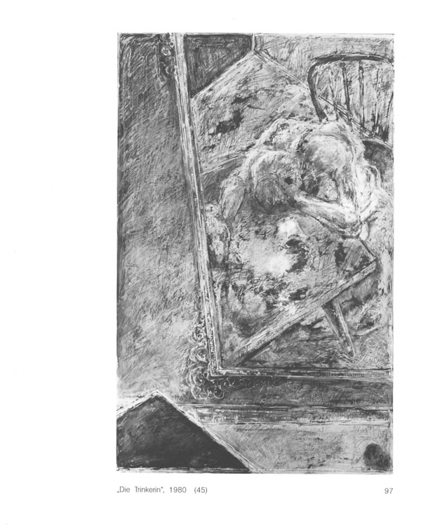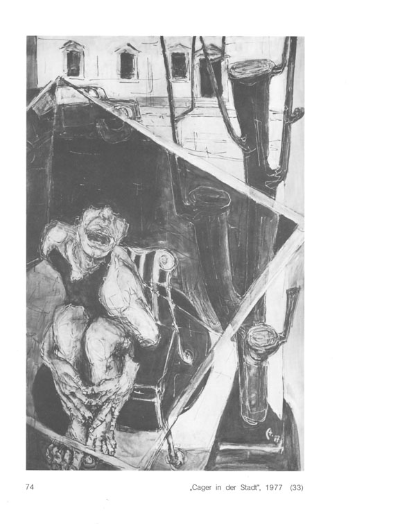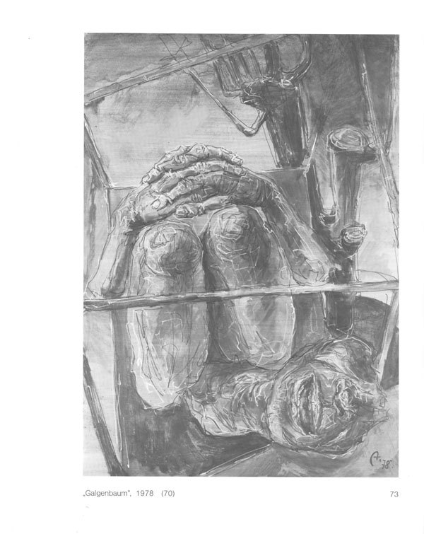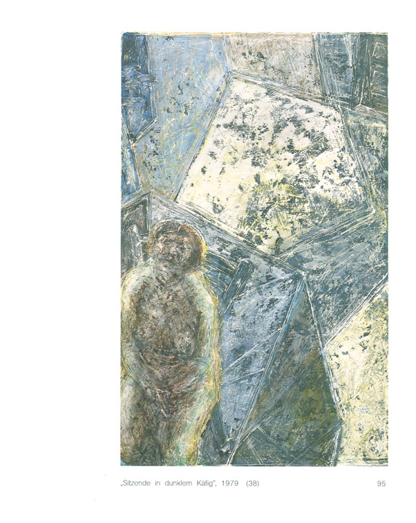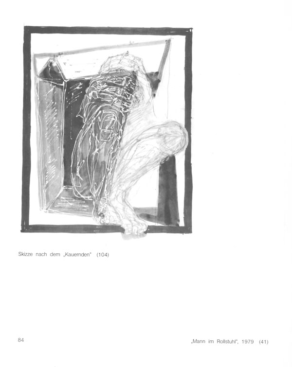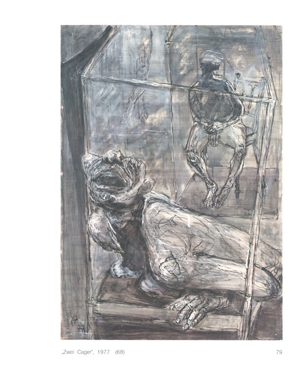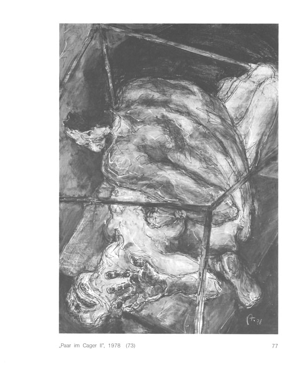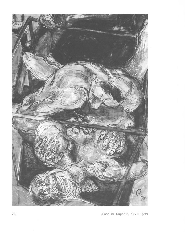 072 "Der Namenlose II", 1977 073 "Galgenbaum" (nach dem "Cager mit Klavierstuhl"), 1978 074 "Cager in der Stadt, 1977 075 "Cager Silo", 1977 076 "Paar im Cager I" (Vergewaltigung I), 1978 077 "Paar im Cager II" (Vergewaltigung II), 1978 078 Zu Cager 22 ("Cager: Liegender Rücken mit Händen"), 1978 079 "Zwei Cager" 1977 080 "Kopfvariation I", 1977 081 "Kopfvariation II", 1977 082 "Selbstbildnis mit gelbem Rand", 1979 083 "Selbstbildnis mit Cager", 1979 084 Skizze nach dem "Kauernden" 085 "Mann im Rollstuhl", 1979 086 "Die Schmerzhafte", 1978/79 087 "Sitzender, Kopf in den Händen", 1979 089 "Bild im Bild", 1979 091 "Frau mit zwei Schatten", 1979 092 "Portrait-Diptychon Ernst Herhaus", 1981 093 "Portrait-Diptychon Ernst Herhaus", 1981 094 Leerseite 095 "Sitzende in dunklem Käfig", 1979 096 "Die Party", 1980, 097 "Die Trinkerin", 1980 098 "Sitzender mit Kopf in Händen II". 1981 099 "Der Aussteiger", 1981 100 Skizze zum "Aussteiger", 5.I.81 101 Skizze zum "Aussteiger", 29.IV.81 102 "Liegende auf Rundbett", 1981 103 Skizze zur "Liegenden auf Rundbett", 1981 104 Skizzen zur "Lachenden", 1981 105 "Die Lachende nach Vangi", 1981
