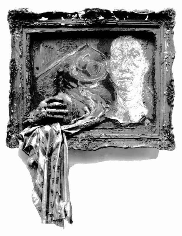 Stilleben-Persiflage"; 1981, 95 x 75 cm, Assemblage, Polyester-Stoff-Acryl