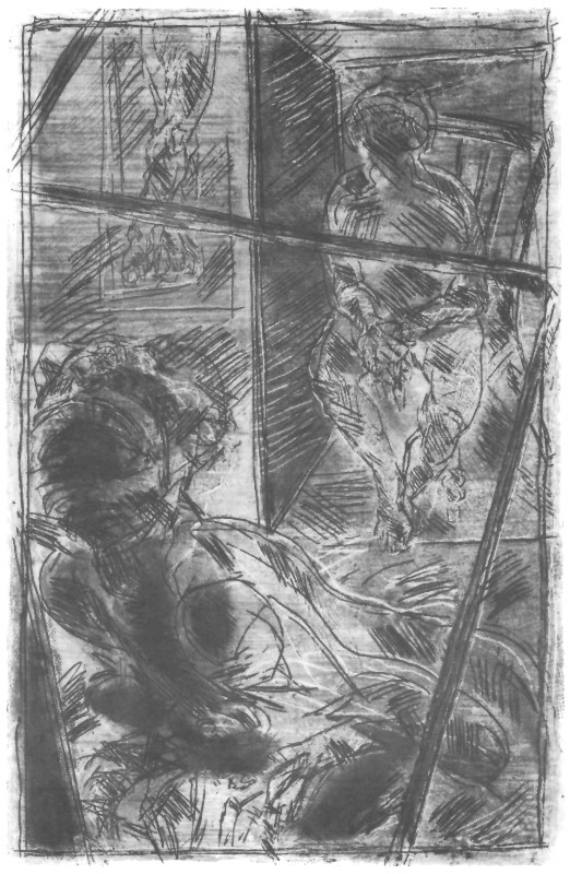 "Zwei Cager"; 1977, 73 x 55 cm, Handzeichnung auf graugestreiftem Papier, Tusche/Acryl