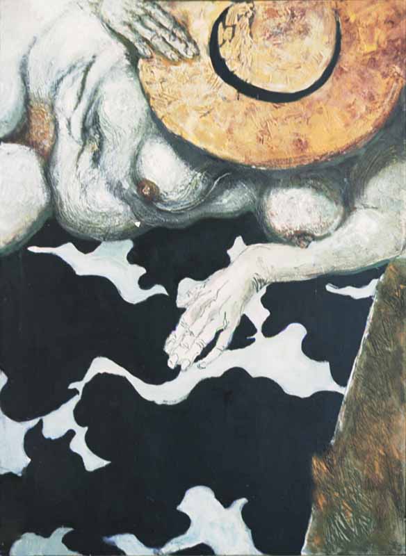 Frau mit Hut auf blauem Sofa ; 1986, |