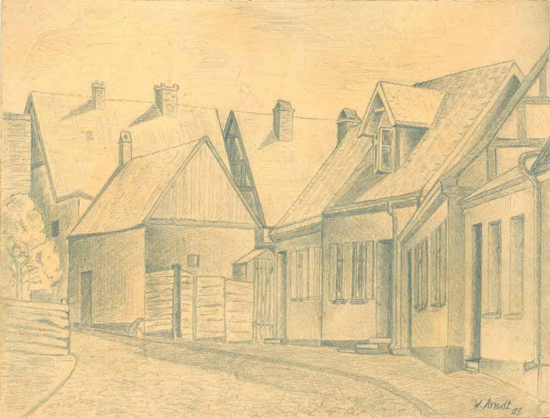 03 "Dorfstraße an der Bergstraße"; 1937, Maße: 24 x 32 cm; Bleistift auf beigem Papier