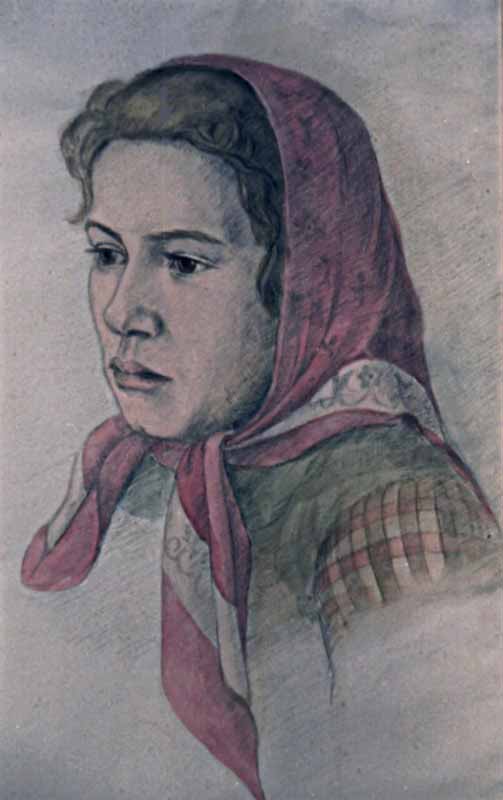 10 "Porträt einer jungen Frau mit rotem Kopftuch"; 1938, Maße: 40 x 13 cm; Bleistift coloriert auf beigem Karton