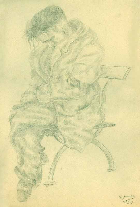 12. Mann auf Bank schlafend ; 1939, Maße: 47 x 32 cm; Bleistift auf beigem Karton