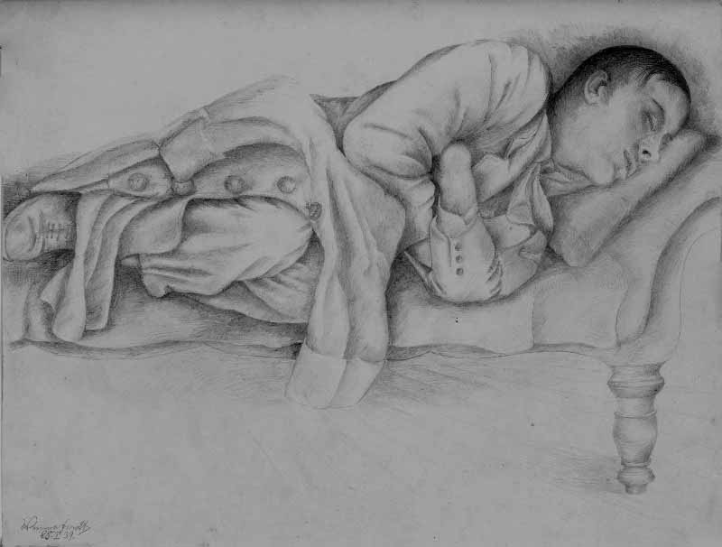13 "Soldat, schlafend"; 1939, Maße: 23 x 29 cm; Bleistift auf grün-beigem Karton