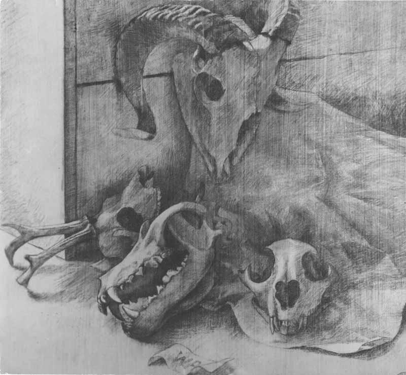 18. Tierschädel-Stilleben ; 1939, Bleistift auf grundiertem Leinen