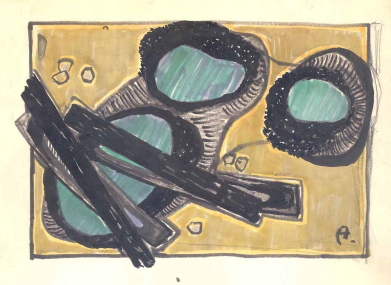 23. Schwarze Hölzer vor gelbem Feld und blauem Muschelfenster; 1967; Maße: 24 x 35 cm, |
