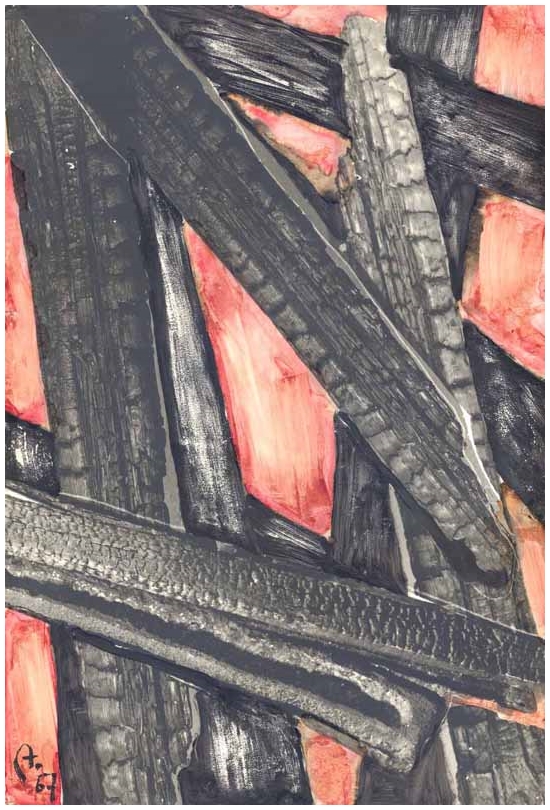 22. Schwarze Hölzer vor rotem Muschelfenster; 1967; Maße: 22 x 38 cm, |