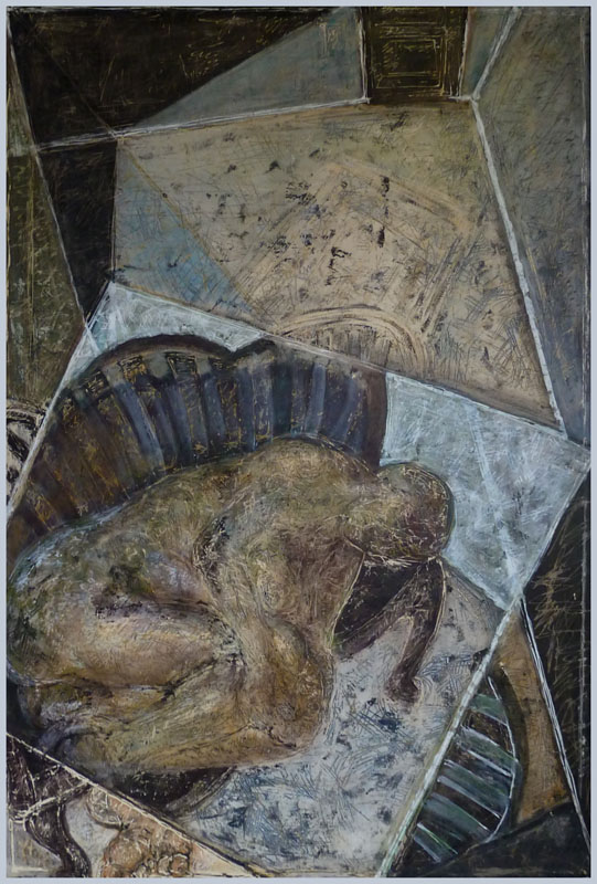 Liegende auf gestreiftem Sofa; 1979, 141 x 96 cm, Gemälde: Mischtechnik, Öl/Acryl auf grundierter Tischlerplatte