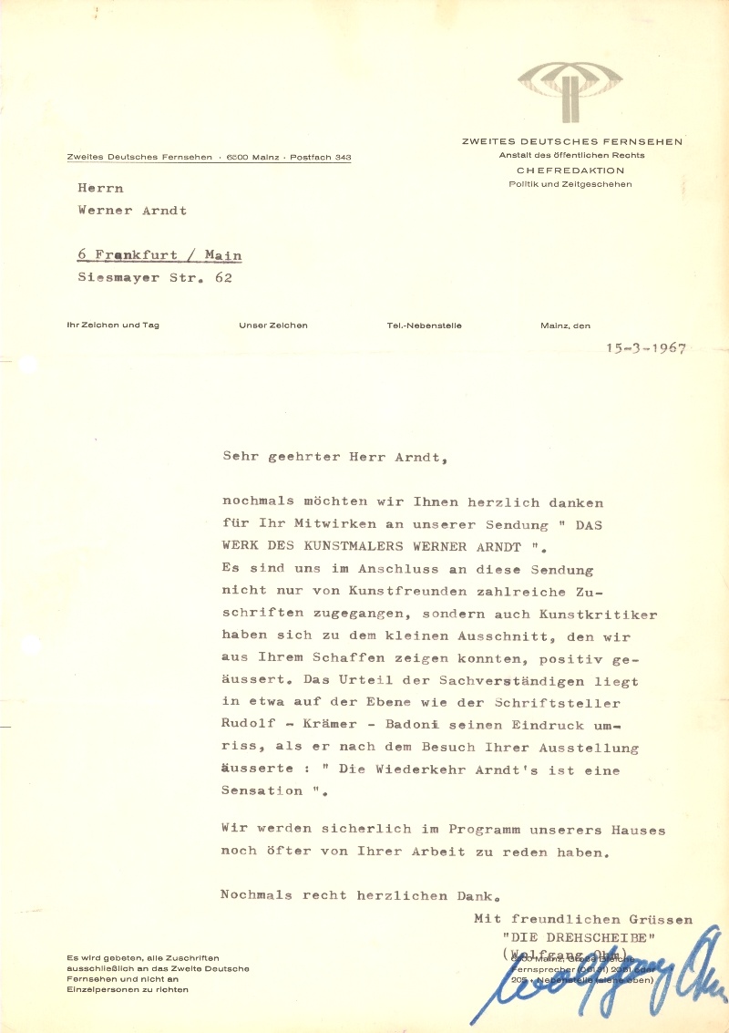 "Das Werk des Kunstmalers Werner Arndt" Fernsehsendung des Zweiten Deutschen Fernsehens 1967 über Werner Arndt