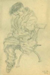 Mann auf Bank schlafend , 1939, Maße: 47 x 32 cm, Zeichnung, Bleistift auf grün-beigem Karton, sign. u. dat. u.r. "W.Arndt 18.I.39",