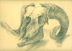 Schädel eines Widders, 1939, Maße: 24 x 32 cm, Zeichnung, Bleistift auf beigem Karton, sign. u. dat. u.r. "Werner Arndt 39". Auf der Rückseite: Die Skizze zum Widderschäel, Reg.Nr.: E39-26/27a-20