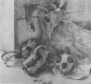 Tierschädel-Stilleben, 1939, Maße unbekannt; Zeichnung, Bleistift, Verbleib unbekannt; sign. u.m. "WA"; Abb.: von Foto, Reg.Nr.: Z39-30/11