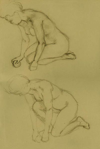 Weibliche Aktstudien, kniend, 1940, 58 x 40 cm, Zeichnung, Braune Kreide, auf braunem Papier