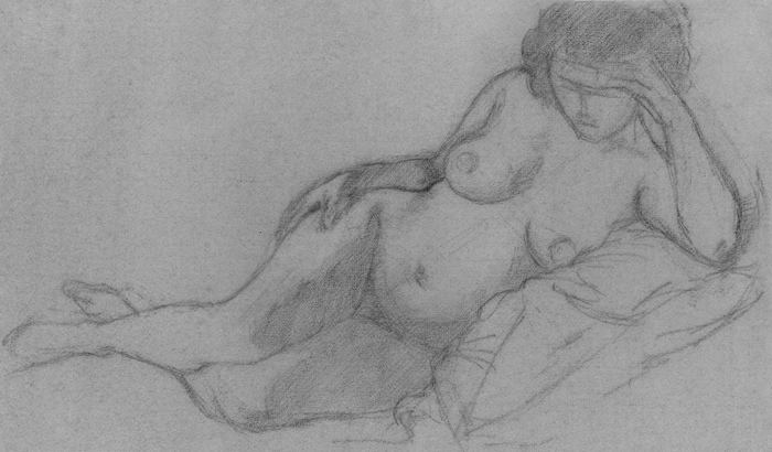 Weiblicher Akt auf Bett liegend, 1940, 28 x 44 cm, Zeichnung, Bleistift auf grauem Papier