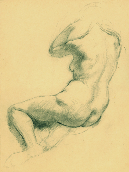 Akt, weiblich, seitlich sitzend, Rückenansicht, 1940, 40 x 30 cm, Zeichnung, Bleistift auf grün-gelbem Karton