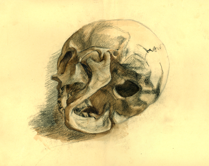 Schädel, 1940, 30 x 37 cm, Zeichnung, Kreide mit Aquarellfarbe auf gelbem Karton