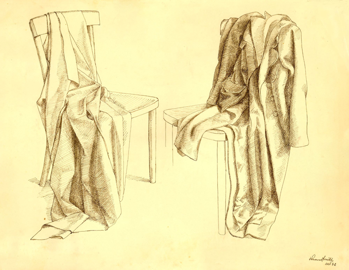 Stilleben m. Stühlen u.Kleidungsstücke 1940, 36 x 44 cm, Zeichnung, Tusche auf beigem Karton