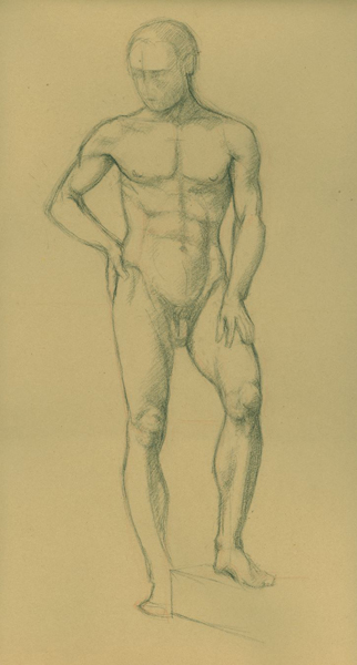 Männlicher Akt stehend, Vorderansicht, 1940, 58 x 40 cm, Zeichnung, Bleistift auf braunem Zeichenpapier