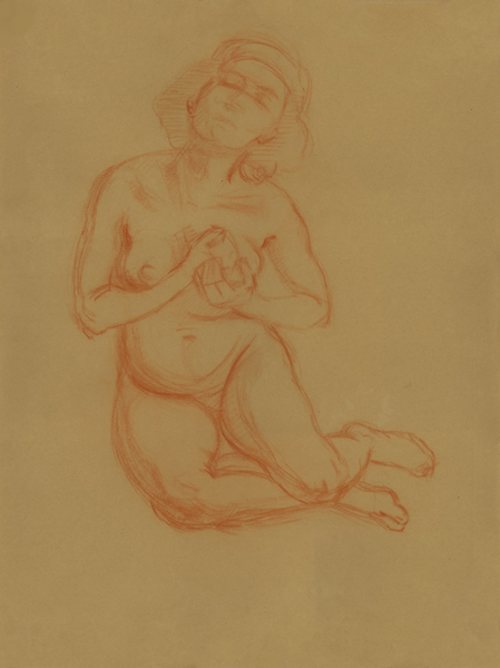 Akt, weiblich, seitlich hockend und mit Händen an linker Brust, 1941, 58 x 44 cm, Zeichnung, Rötelstift auf braunem Zeichenblockpapier