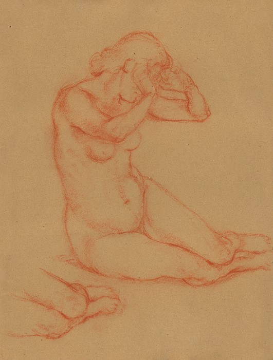 Akt, weiblich, seitlich hockend mit Händen Kopf haltend, 1941, 58 x 44 cm, Zeichnung, Rötelstift auf braunem Zeichenblockpapier