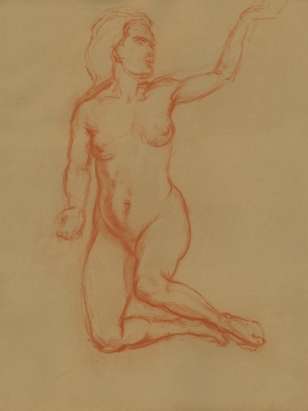 Akt, weiblich, seitlich kniend, linker Arm gehoben, 1941, 58 x 44 cm, Zeichnung, Rötelstift auf braunem Zeichenblockpapier