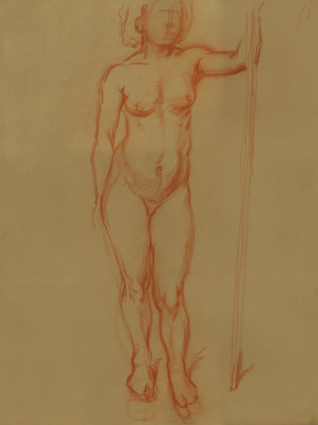 Akt, weiblich, frontal stehend, linke Hand Stab haltend, 1941, 58 x 44 cm, Zeichnung, Rötelstift auf braunem Zeichenblockpapier
