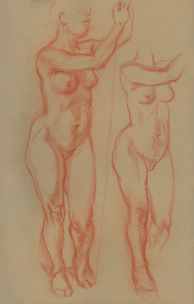 Zwei Akte, weiblich, seitlich stehend, 1941, 58 x 33 cm, Zeichnung, Rötelstift auf braunem Zeichenblockpapier