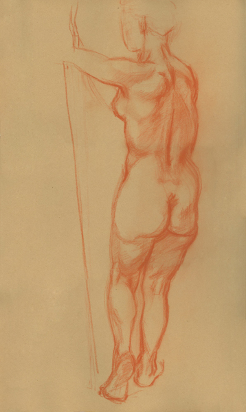 Akt, weiblich, stehend, Rückenansicht, 1941, 58 x 44 cm, Zeichnung, Rötelstift auf braunem Zeichenblockpapier