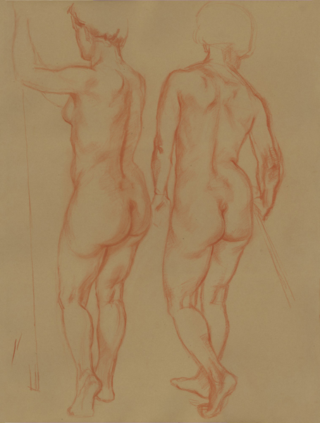 Zwei Akte, weiblich, seitlich stehende Rückenansicht, 1941, 58 x 44 cm, Zeichnung, Rötelstift auf braunem Zeichenblockpapier