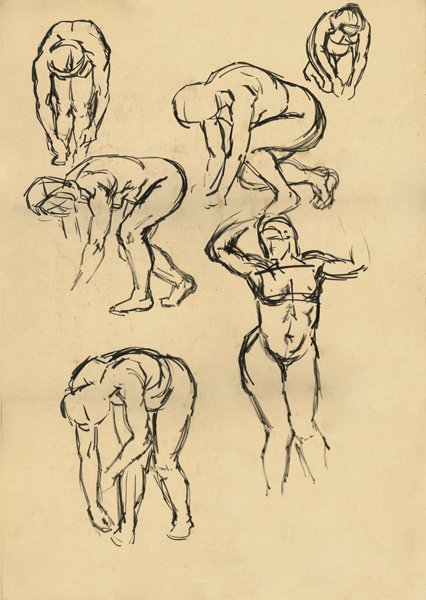 Akte in verschiedenen Stellungen, 1941, 60 x 40 cm, Zeichnung, Schwarze Tusche auf beigem Karton