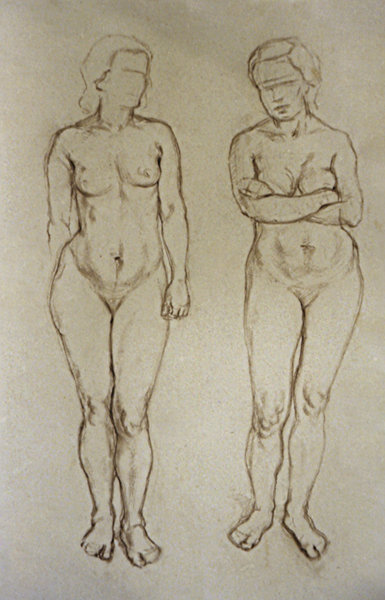 Zwei Akte stehend, frontal, 1941, 60 x 40 cm, Zeichnung, braune Kreide auf beigem Karton