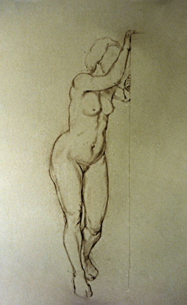 Akt, weiblich, stehend, seitlich angelegt, 1941, 60 x 40 cm, Zeichnung, Braune Kreide auf beigem Karton
