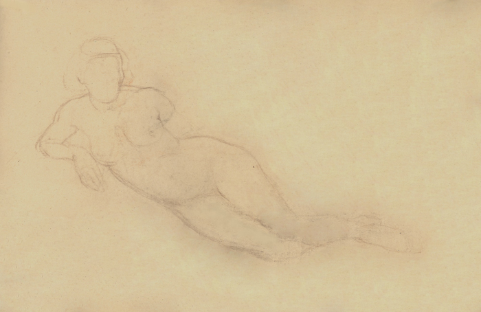 Akt, weiblich, liegend, 1941, 38 x 60 cm, Zeichnung, Kohle auf beigem Karton