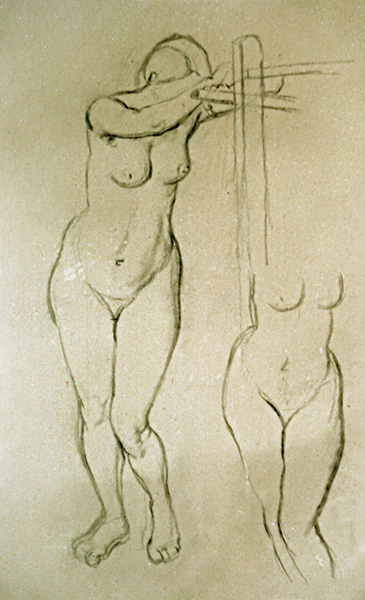 Akt stehend an Gestell gelehnt u. Akttorso, Vorderansicht, 1941, 60 x 40 cm, Zeichnung, Kohle auf beigem Karton