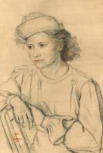 Porträt von A.A. mit Hut, 1941, Maße: 44 x 36 cm, Zeichnung, Kohle- u. Rötelstift auf beigem Japanpapier, sign. u. dat. ru "Werner Arndt I/41" Erbengemeinschaft Arndt, Reg.Nr.: Z41-14/16