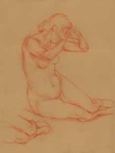 Akt, weiblich, seitlich hockend und mit Händen Kopf haltend, 1941, Maße: 58 x 44 cm, Zeichnung, Rötelstift auf braunem Zeichenblockpapier Erbengemeinschaft Arndt Reg.Nr.: E41-16/32