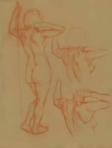 Akt, weiblich, stehend, seitliche Rückenansicht u. 2 Rückenstudien, 1941, Maße: 58 x 44 cm, Zeichnung, Rötelstift auf braunem Zeichenblockpapier, Erbengemeinschaft Arndt Reg.Nr.: E41-27/33
