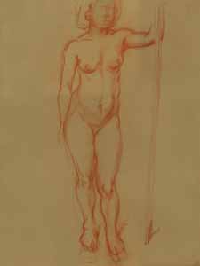 Akt, weiblich, stehend, Arm seitlich aufgestützt, 1941, Maße: 60 x 40 cm, Zeichnung, Braune Kreide auf beigem Karton, Erbengemeinschaft Arndt Reg.Nr.: E41-24/27-50