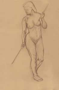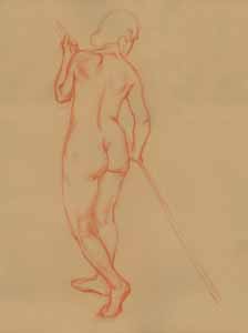 Akt, weiblich, frontal stehend, linke Hand Stab haltend, 1941, Maße: 58 x 44 cm, Zeichnung, Rötelstift auf braunem Zeichenblockpapier, Erbengemeinschaft Arndt Reg.Nr.: E41-27/35