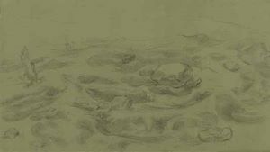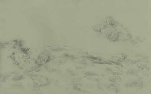 Heidelandschaft mit Steinen, 1941, Maße: 25 x 48 cm, Zeichnung, Bleistiftskizze auf grauem INGRES-Büttenpapier, Erbengemeinschaft Arndt Reg.Nr.: E41-11/32
