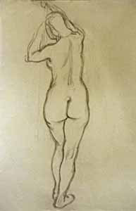 Akt, weiblich, stehend, Rückenansicht, 1941, Maße: 60 x 40 cm, Zeichnung, Kohle auf beigem Karton, Erbengemeinschaft Arndt Reg.Nr.: E41-24/14