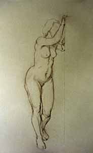 Akt, weiblich, stehend mit erhobenen Armen, Vorderansicht, 1941, Maße: 60 x 40 cm, Zeichnung, Braune Kreide auf beigem Karton, Erbengemeinschaft Arndt Reg.Nr.: E41-16/28